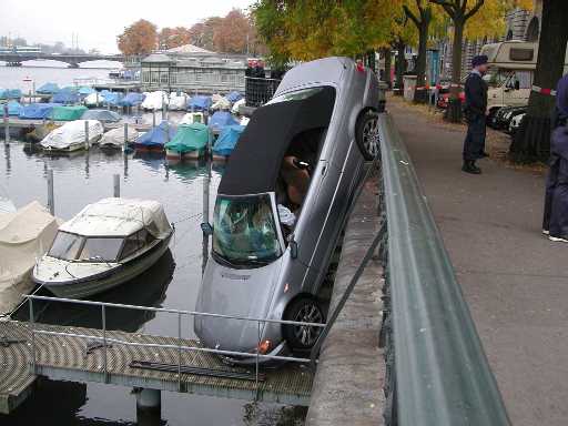 Bei einem Selbstunfall infolge einer Fehlmanipulation durchbrach eine 37-jährige Autolenkerin am Freitag, 29. Oktober 2004, kurz nach 15.30 Uhr, mit ihrem Wagen am Stadthausquai das Geländer am Limmatufer und landete auf einem darunterliegenden Steg. Die Frau hatte ihr Auto auf einem der Parkfelder gegenüber des Stadthauses mit Front zur Limmat abgestellt. Gemäss eigenen Angaben wollte sie unmittelbar vor der Wegfahrt, bereits mit laufendem Motor, die Schuhe wechseln. Dabei muss sie aufs Gaspedal getreten sein, worauf ihr Auto vorwärts über das