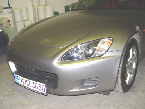 Die seitlichen "Honda"- sowie "S2000"-Embleme (auf den Kotflügeln) sind nur geklebt. Ich habe sie mit einer dünnen Paketschnur, die ich vorsichtig zwischen Emblem und Lack gezogen habe, "abgeschnitten". Die Kleberrest kann man mit einem Haarfön erwärmen und dann vorsichtig abrubbeln. Die "H"-Embleme auf Frontschürze und Heckklappe sind dagegen geklebt und gesteckt (also Löcher darunter). -