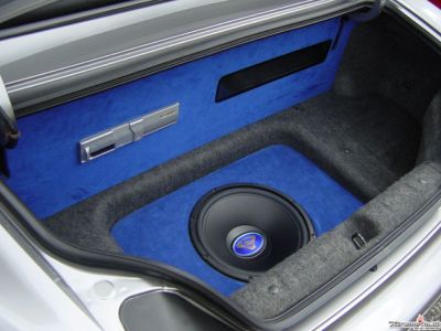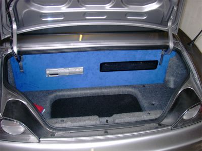 - Rückwand: mit Plexiglas Schaufenster für die Endstufen, Alpine CD-Wechsler Ausschnitt, mit blauem Alcantara bezogen