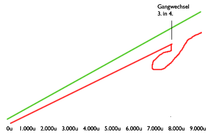wenn du aus dem 3. beschleunigst und beim 4. reinschaltest..sollte die beschelunigung permanent steigen. er fällt aber sofrt ab bis auf 6.000u wenn ich den 4. reinhaue und steigt erst dann wieder langsam hoch. -
