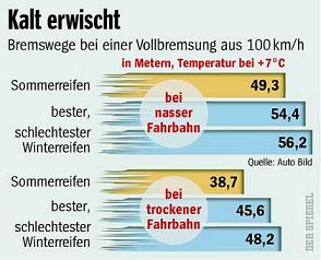 Im Gegenteil: Beim jährlichen Winterreifentest lässt das Fachblatt "Auto Bild" immer einen Referenz-Sommerreifen mitfahren. Die Ergebnisse sind eindeutig: Auf Schnee rutscht das Sommerprofil fast doppelt so weit. Bei Vollbremsungen auf nasser und trockener Fahrbahn dagegen bremst es deutlich besser als die besten Winterreifen - auch bei Fahrbahntemperaturen von sieben Grad und weniger.