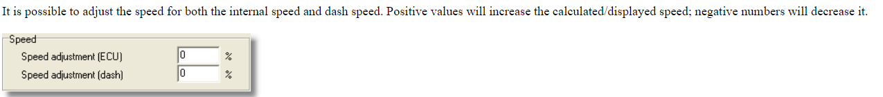 Es gibt die Möglichkeit die Korrektur sowohl für Logfiles anzupassen (Speed adjustment ECU) als auch für den Tacho (Speed adjustment Dash)