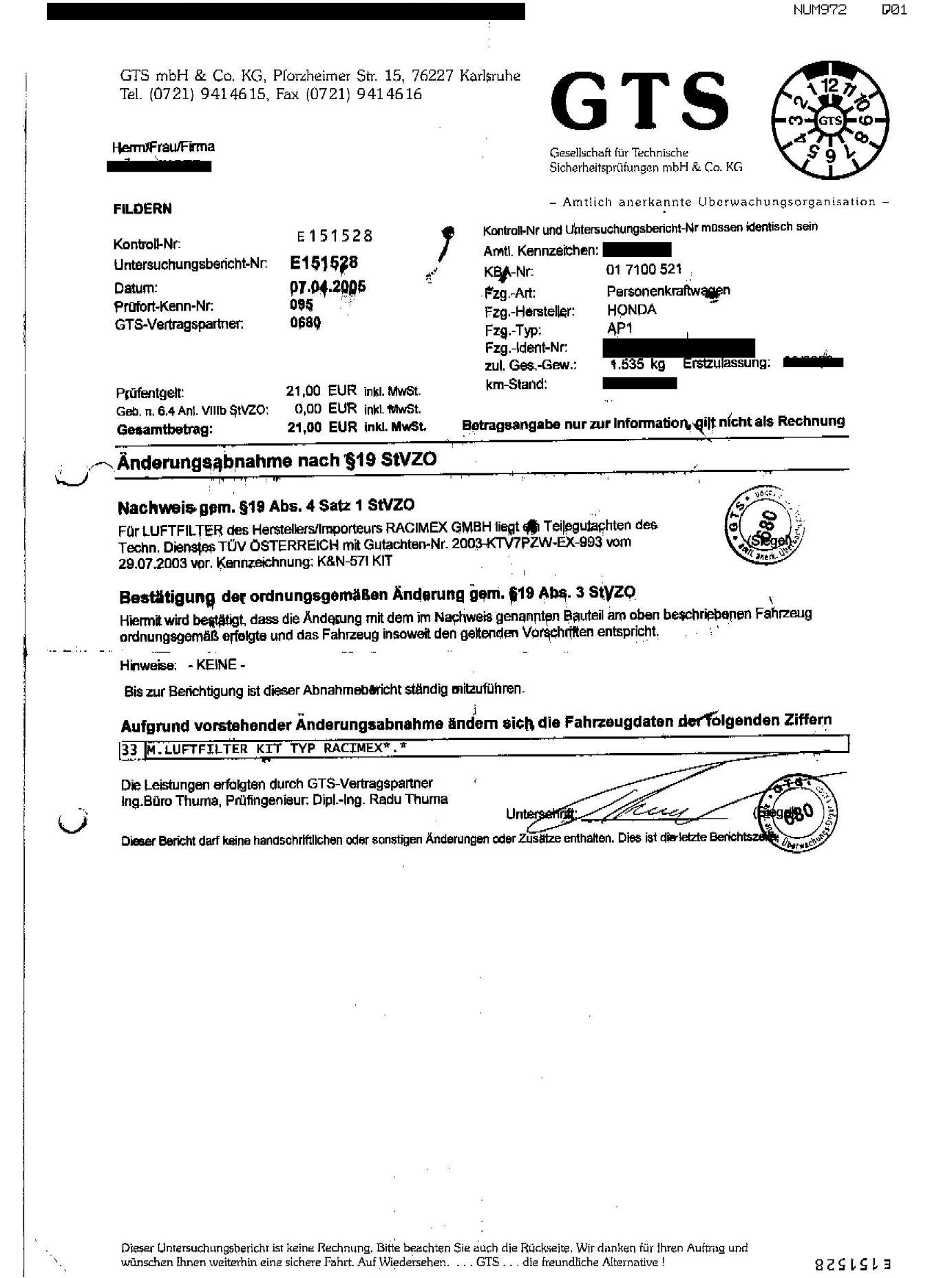 Da dieses Kit ein Gutachten hat (vgl. Nummer auf dem Gutachten und Nr. auf dem Kit), ist eine Eintragung absolut problemlos.
