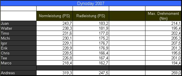 So, hier also die versprochenen PDF`s aller getesteten Fahrzeuge vom CH-Dynoday 19.Mai 2007