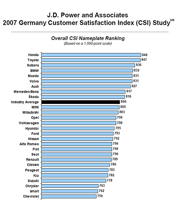 Wenn es um die Kundenzufriedenheit geht, kann den Japanern so schnell keiner was vormachen: In der aktuellen Studie des US-Instituts J.D. Power führen die Automodelle aus Fernost in fünf von sieben Segmenten die Rangliste an. Besonders zufrieden sind die deutschen Autofahrer mit Produkten von Toyota und Honda: Drei beziehungsweise zwei Segmente gehen an diese Hersteller. Ehrenretter aus deutscher Sicht ist BMW: Die Bayern können wenigstens den ersten Zufriedenheitsplatz in der Oberklasse belegen.