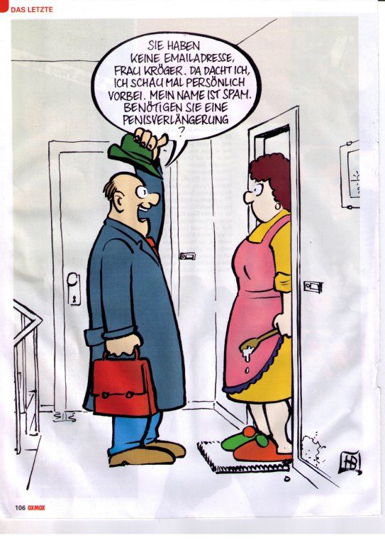 Schon gewusst, dass die Bezeichnung "Spam" auf einen Sketch von Monty Python zurückgeht? :o Dort ist die Fleischpastete dieses Namens bei allen Gerichten auf der Speisekarte - teils mehrfach! - enthalten. Ohne gehts nicht. Genau das ist ja auch der Fall bei den Mails... :?