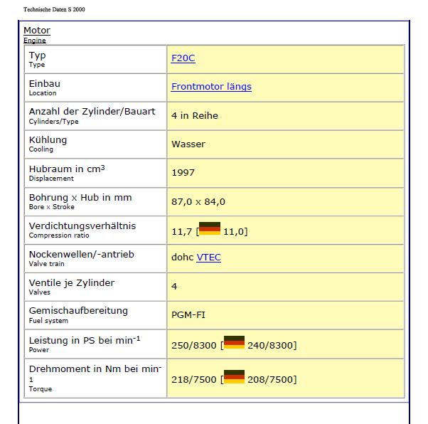 ZitatIt features a front-mid-engine, rear wheel drive layout with power being delivered by a 1,997 cc (122 cu in) F20C inline 4 cylinder DOHC-VTEC engine producing 240 hp (179 kW) at 8,300 rpm and 153 ft·lbf (207 N·m) at 7,500 rpm, though European versions were rated slightly lower at 237 hp (177 kW) and the Japanese models were quoted with 247 hp (184 kW) at 8,600 rpm due to a small difference in engine compression ratio.