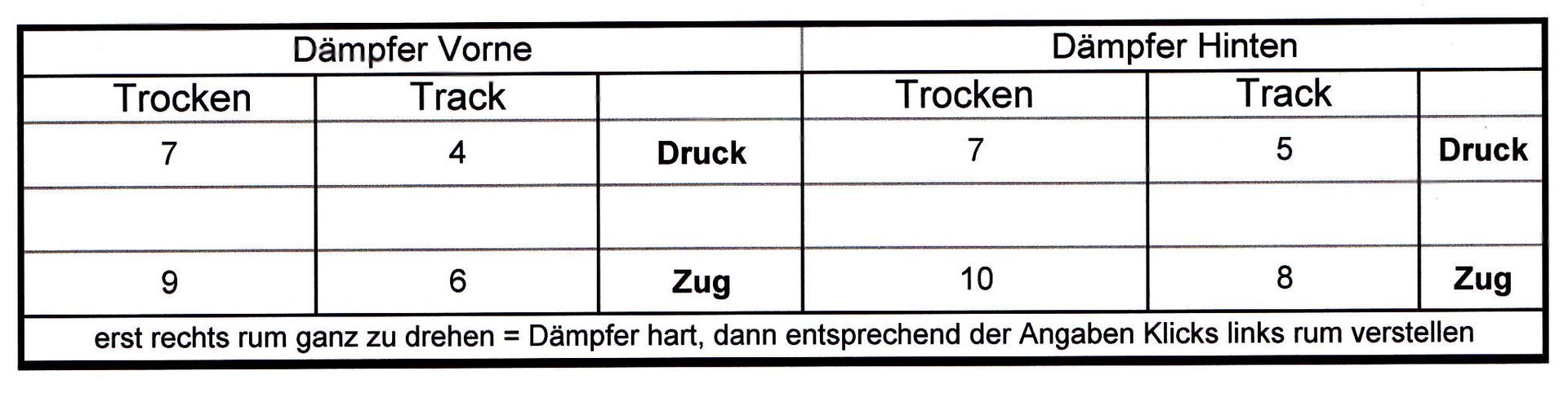 Ich will vor allem auf die Werte der Hinterachse eingehen da die Hinterachse viel schwieriger in den Griff zu bekommen ist und sensibler auf falsche Einstellungen reagiert als die Vorderachse.