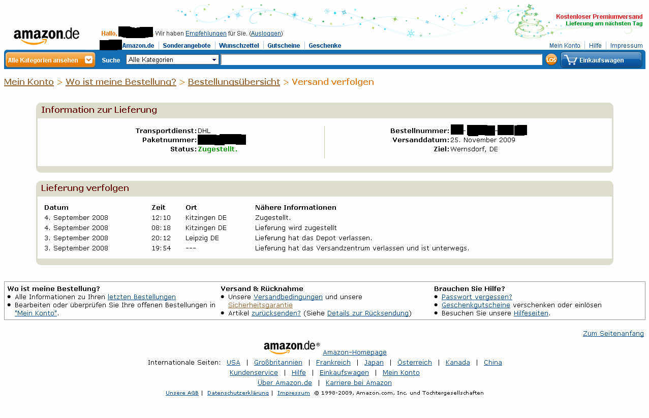 Man die liefern schnell, November 2009 bestellt und schon im September 2008 zugestellt. Anbei der Beweis. Hab ich heute so in der Auftragsverfolgung vorgefunden. Das einzigste was da stimmt ist das Versanddatum, der Rest vom geschriebenen ist EDV Schrott.