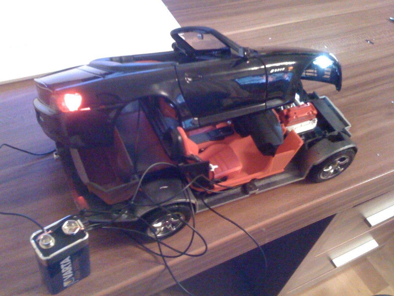 Man kann den Kofferraum vom Modell wegschneiden und dann dort eine 9V Batterie (die eckige) reinlegen, geht sich perfekt aus..