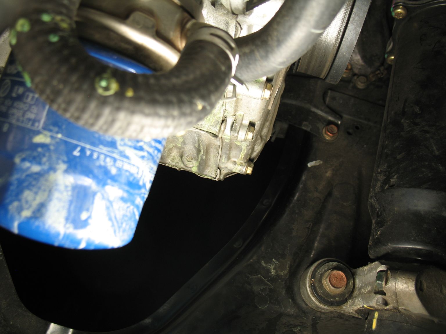 Der Motor war dabei sehr häufig im V-Tec. Ich hab dann heute mal einen kurzen Check gemacht und dabei ist mir aufgefallen, dass der Ölfilter und ein Teil des Motorblocks mit Kühlmitteln eingesaut sind.