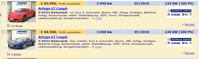 Ach ja der Preis liegt bei 60000 Euro fuer einen nagelneuen Artega GT mit 0km