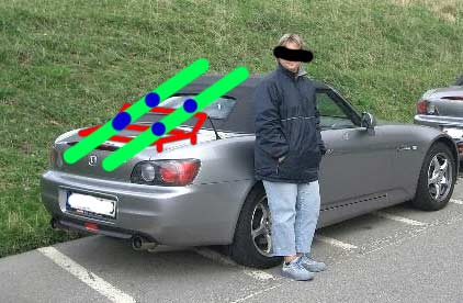 So stelle ich mir das ungefähr vor. Grün sind Skier, rot ist der Gepäckträger.