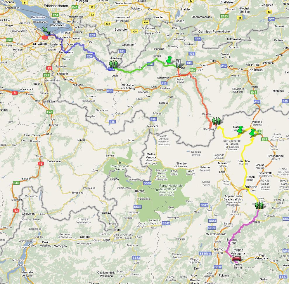 Die Route führt uns zuerst dem Bodensee entlang, dann geht es ganz kurz auf die Autobahn. Bei Diepoldsau überqueren wir die Grenze nach Österreich. Nach der Grenze wird kurz ein Sammelplatz angesteuert, auf dem sich die ganze Truppe wieder versammeln kann, für den Fall dass der eine oder andere am Zoll kontrolliert werden sollte. Anschliessend gehts noch kurz durch Dornbirn, dann aber kommen endlich die Kurven. Wir fahren hoch zum Hochtannbergpass (1'679 m.ü.M.), wo wir um ca. 11.00 Uhr ankommen. Hier machen wir 20 Minuten Pause. Anschliessend gehts weiter über das Hahntennjoch (1'894 m.ü.M.) nach Imst, wo wir im Alpenhotel Linserhof gegen 12.20 Uhr eintreffen und Mittagspause machen werden bis 13.50 Uhr. Anschliessend gibts bei Bedarf eine erste Möglichkeit zu tanken. Anschliessend fahren wir hoch zum Timmelsjoch (2'474 m.ü.M.) wo wir gegen 15.10 Uhr ankommen sollten und eine Pause von 20 Minuten machen werden. Nun gehts über die Grenze nach Italien ins Südtirol. Wir überwinden den Jaufenpass (2'104 m.ü.M.) und das Penserjoch (2'211 m.ü.M.), durchqueren Bozen und erreichen schliesslich gegen 18.00 Uhr den Passo di Lavazè (1'808 m.ü.M.), wo nochmals eine Pause von 20 Minuten geplant ist. Anschliessend nehmen wir noch das letzte Stück unter die Räder und kommen etwa gegen 19.30 Uhr in Levico Terme an, wo wir uns im Hotel Elite einquartieren werden. Abendessen gibts im Hotel.