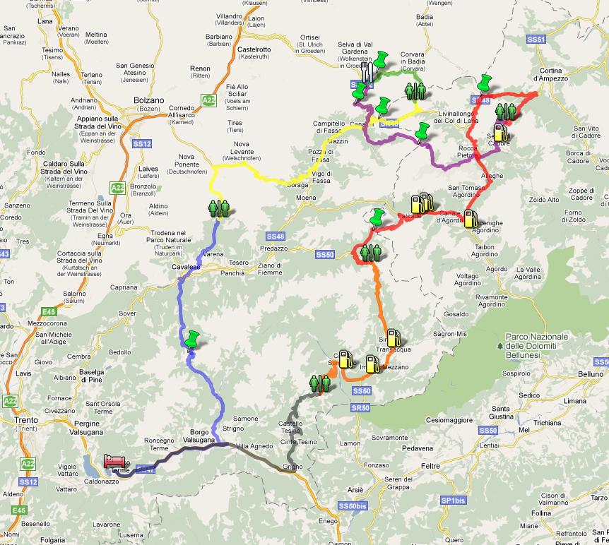 Heute ist die grosse Tour angesagt! Um 08.00 Uhr fahren wir los, überqueren als erstes den Passo Manghen (2'047 m.ü.M.) und gelangen anschliessend so gegen 09.30 Uhr auf den Passo di Lavazè (1'808 m.ü.M.), welchen wir schon von gestern kennen (diesmal aber von der anderen Seite). Hier machen wir 20 Minuten Pause. Es geht weiter über den Karerpass (1'745 m.ü.M.) und anschliessend folgen Schlag auf Schlag der Passo Pordoi (2'239 m.ü.M.), und der Passo Campolongo (1'875 m.ü.M.), wo wir um 11.10 Uhr ankommen und eine Pause von 20 Minuten einlegen werden. Anschliessend folgt das Grödnerjoch (2'121 m.ü.M.), und gegen 12.00 Uhr kommen wir, nur wenig unterhalb der Passhöhe des Grödnerjochs zum Chalet Gerard, wo wir bis 13.30 Uhr Zumittag essen werden. Nach dem Mittagessen folgen das Sellajoch (2'240 m.ü.M.) und der Passo di Fedaia (2'057 m.ü.M.), und um 14.45 Uhr erreichen wir den Passo di Giau (2'236 m.ü.M.) wo wir wiederum eine Pause von 20 Minuten einlegen. Das muntere Pässeräubern geht weiter, es folgen der Passo di Falzarego (2'105 m.ü.M.) und der Passo di Valles (2'032 m.ü.M.), bevor wir um 16.45 Uhr den Passo Rolle (1'989 m.ü.M.) erreichen, wo wir wieder 20 Minuten Pause einlegen werden. Nun folgt noch der Passo Brocon (1'616 m.ü.M.), wo nochmals ein kurzer Stopp von 10 Minuten eingeplant ist, bevor das letzte Stück zurück Richtung Hotel Elite in Levico Terme folgt, wo wir um etwa 19.15 Uhr ankommen sollten. Anschliessend gibts wieder Abendessen im Hotel. (Ein Tankstopp wird natürlich ebenfalls noch mit eingeplant - dazu müssen wir aber zuerst die Route abfahren um geeignete Tankstellen lokalisieren zu können - dementsprechend dürften sich die o.g. Zeiten inkl. des Tankstopps um etwa 20-30 Minuten nach hinten verschieben).