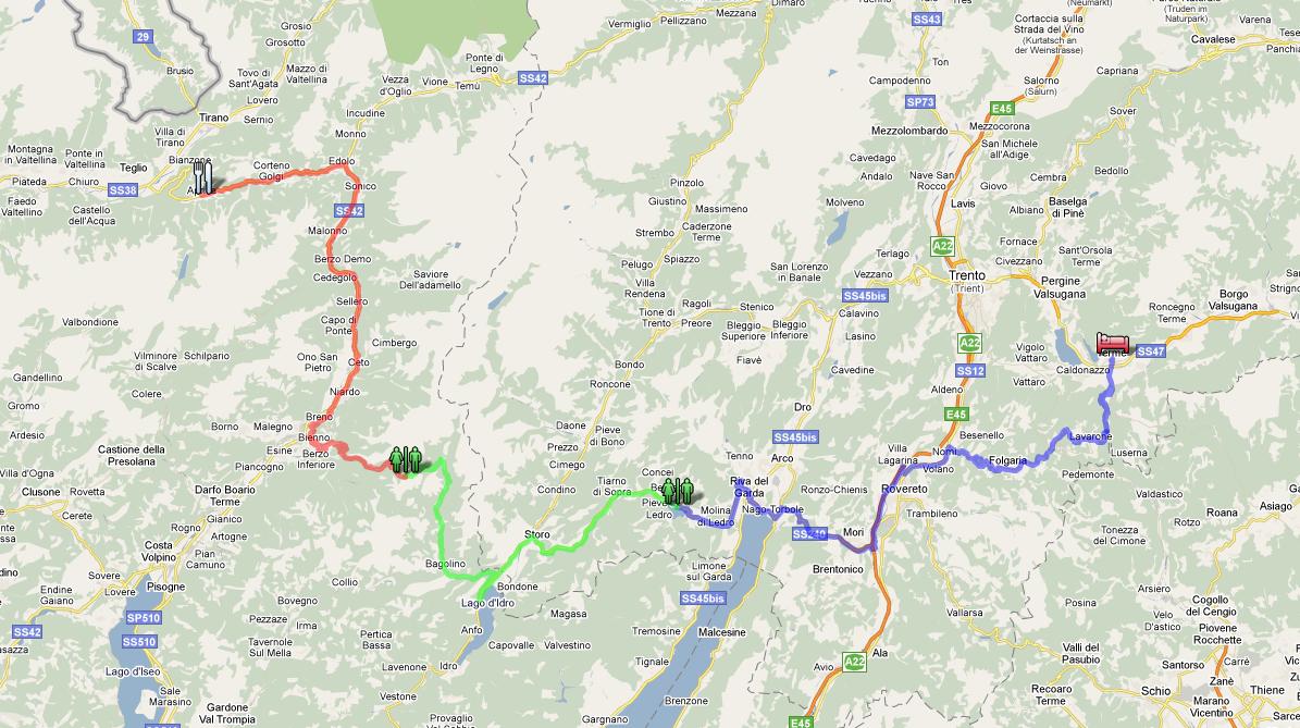 Die Strecke führt uns von Levico Terme her über den Passo del Sommo (1'341 m.ü.M.), hinunter zum Gardasee und von dort weiter zum Lago di Ledro. Dort werden wir eine Pause von 20 Minuten einplanen. Anschliessend gehts hoch zum Passo di Croce Domini (1'892 m.ü.M.) wo ebenfalls nochmals 20 Minuten Pause angesagt sind. Schlussendlich gelangen wir nach Aprica, wo wir uns gemeinsam ein nettes Restaurant fürs Mittagessen suchen können. Ab hier endet dann der organisierte Teil und es können alle ihren individuellen Heimweg antreten, jedenfalls ist hier nun allgemeines Tschüss-sagen angebracht. Ich für meinen Teil werde anschliessend wahrscheinlich via Berninapass ins Engadin und weiter via Julierpass und Lenzerheide nach Chur wo dann schlussendlich die Autobahn wartet.