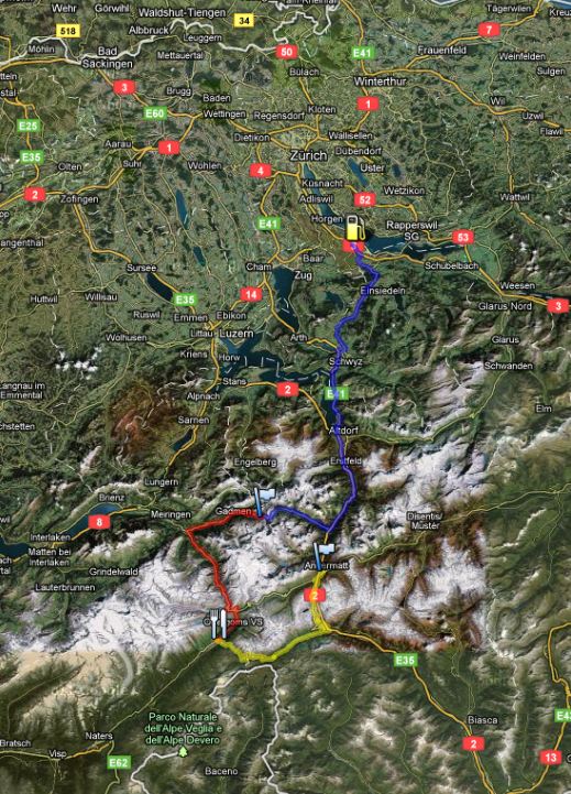 via Sattel, Axenstrasse, alte Gotthardstrasse nach Wassen, dann über den Susten- und den Grimselpass ins Wallis. Mittagessen in Ulrichen im Hotel Astoria. Anschliessend über den Nufenenpass nach Airolo und dann die Tremola hoch (falls offen - sonst halt Gotthardpass) nach Andermatt. Anschliessend könnte man sich hier verabschieden oder die Route nach Belieben noch weiter verlängern.