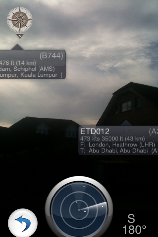 Und wie gesagt, das witzigste Gimmik finde ich das Anvisieren mit der Kamera. Wenn du einen Flieger am Himmel siehst schaltest du die App ein, aktivierst die Kamera und in dem Bild der Kamera wird dir das Callsign des Fliegers gezeigt und du bekommst sämtliche Infos zu dem Vogel.