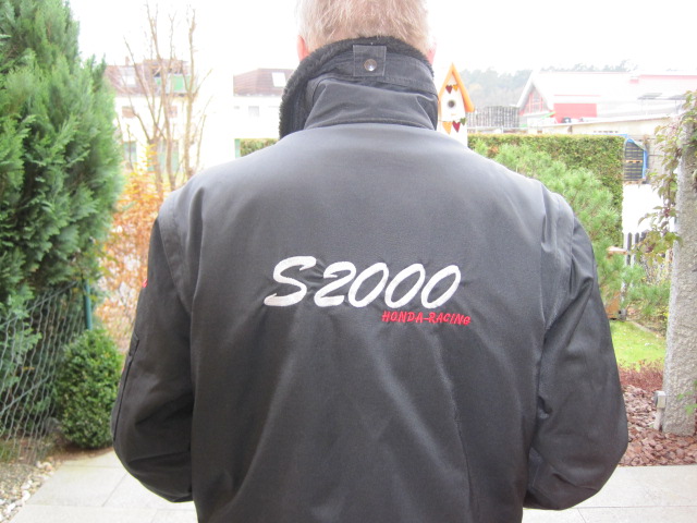 Die Jacke habe ich vor einiger Zeit hier im Forum neu gekauft. Auf den Ärmeln ist das Honda-Logo aufgestickt, auf dem Rücken "S 2000 Honda-Racing", vorne ebenfalls "Honda-Racing" und "S2K-Owners-Club". Das Innen-Teddy-Fell ist herausknöpfbar.