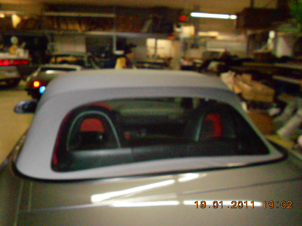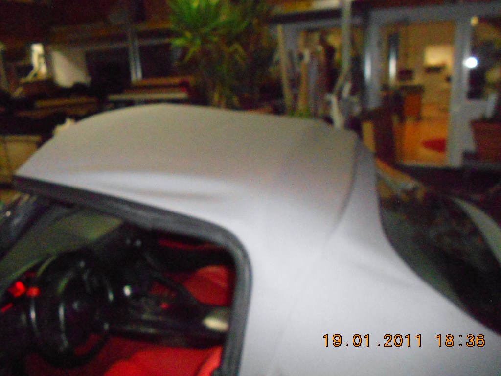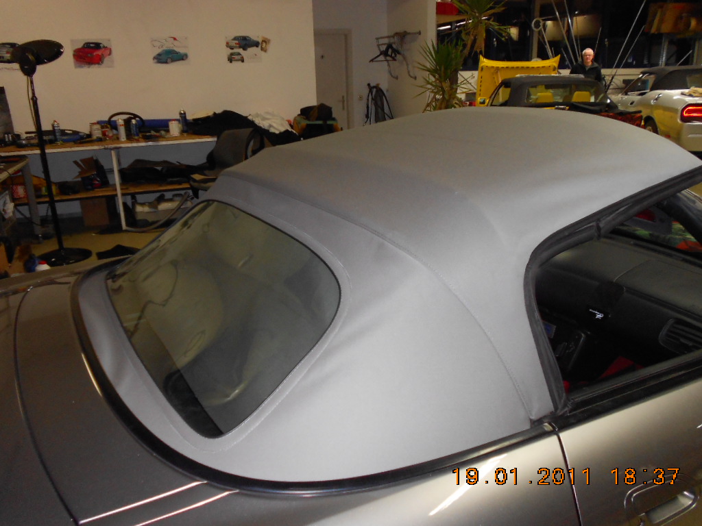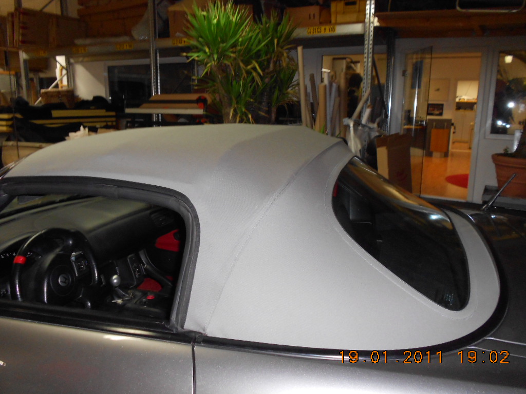 Nachdem ich zwei Jahren mit gerissener Heckscheibe und zwei Löchern im Dach, an der bekannten Problemstelle, gefahren bin, musste ein Stoff- und kein Vinyldach her. Über einen Sattler sollte ein Sonnenland-Verdeck montiert werden. Der Sattler war leider nicht imstande ein Sonnenlandverdeck in meiner Wunschfarbe zu beschaffen. Darauf hin habe ich mich bei der Firma Eurotop erkundigt , mit dem Ergebniss das S2000 Dächer so gut wie gar nicht gekauft werden und deshalb nur in Schwarz produziert werden. Dann habe ich im Internet die Firma CK-Cabrio Manufaktur https://s2k.de/www.ck-cabrio.de in Giessen gefunden. Nach dem ersten telefonischen Gespräch mit dem Chef Herrn Klein war mir klar das ich dort Kunde werde. Am 19.1.2012 hatte ich dann einen Termin zur Montage in Giessen. Hier ist das Ergebniss: