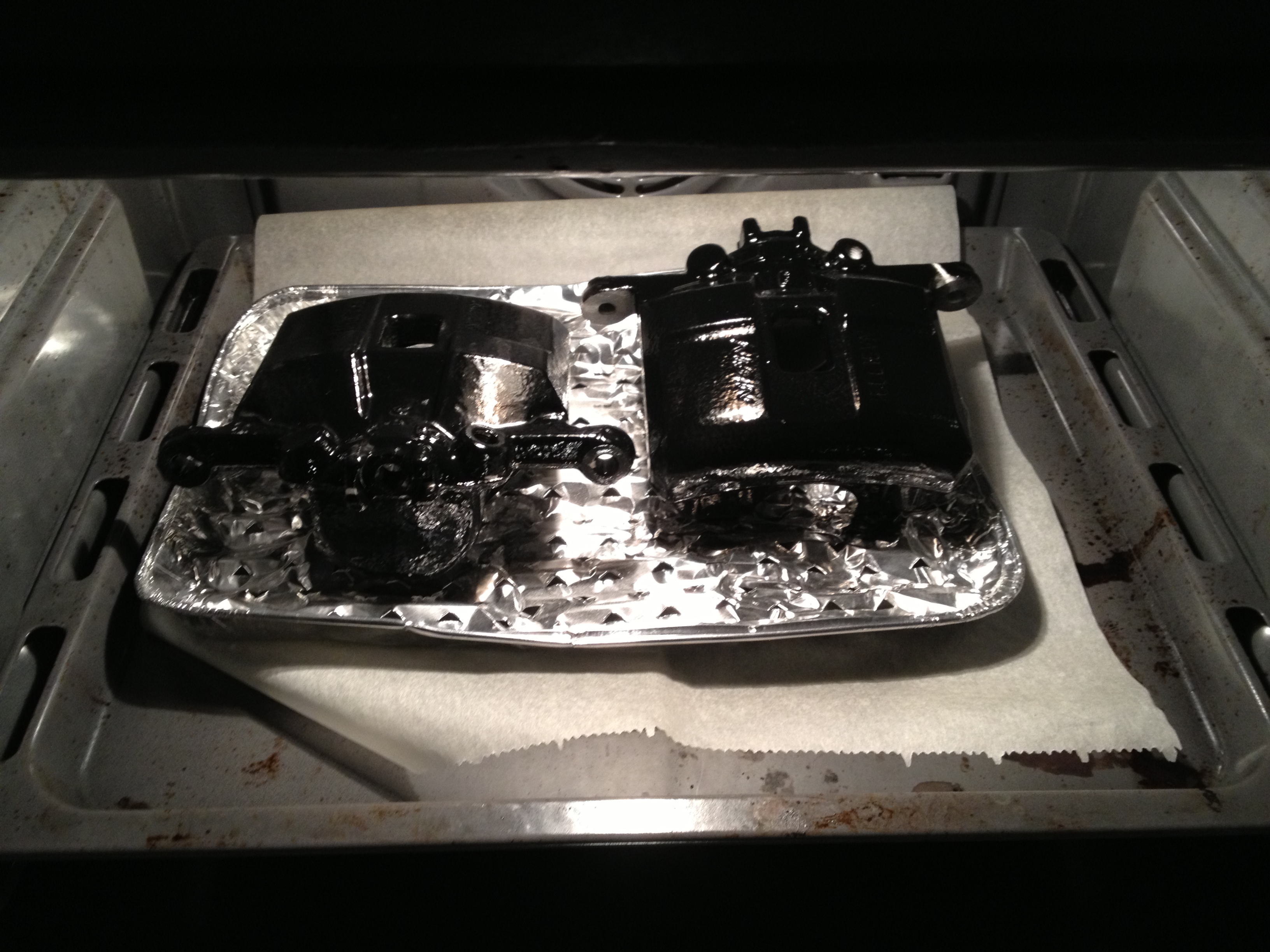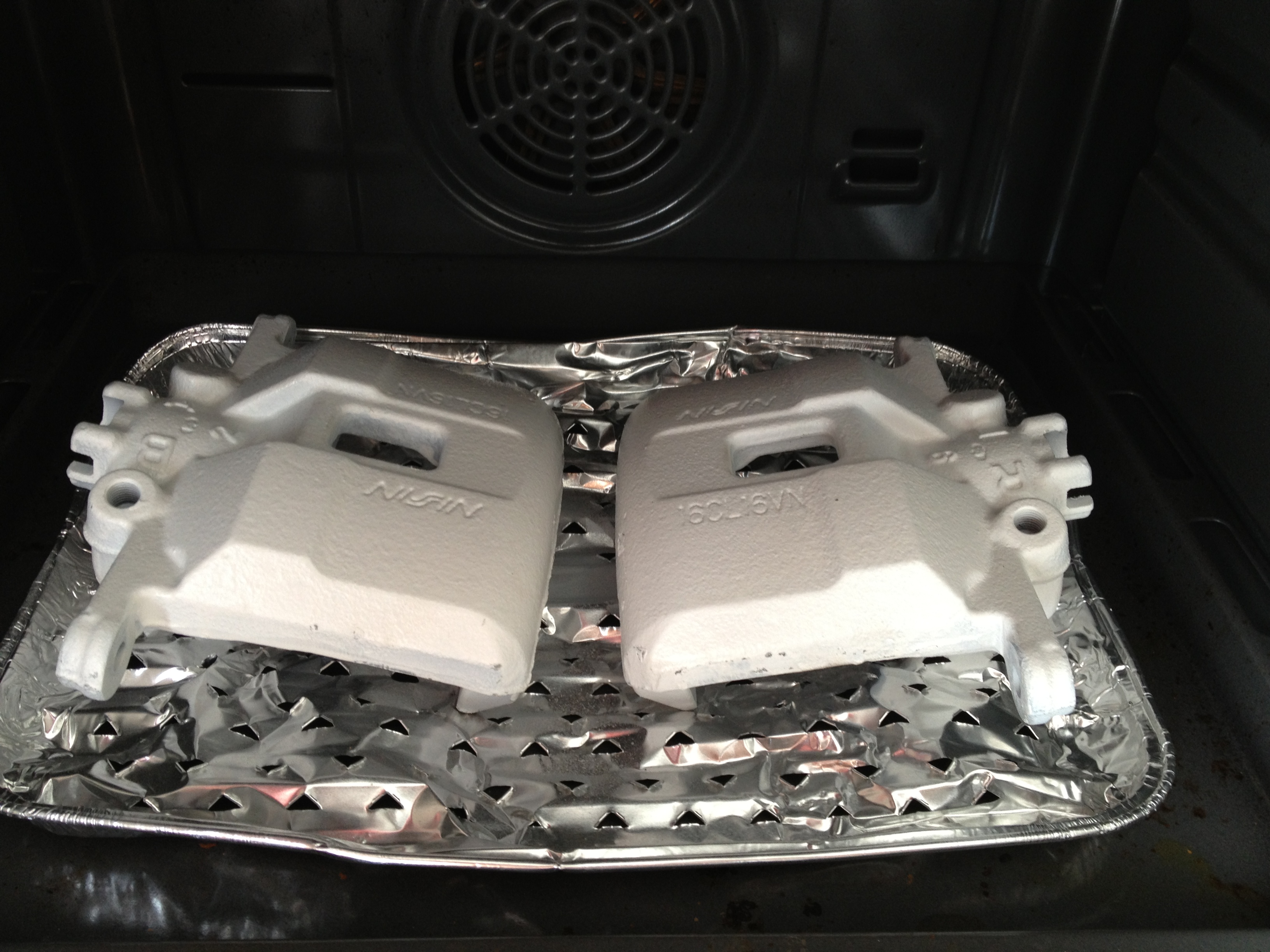 Saubere entfettete Bremsenteile in den Backofen bei Umluft auf ca. 100 Grad vorwärmen.