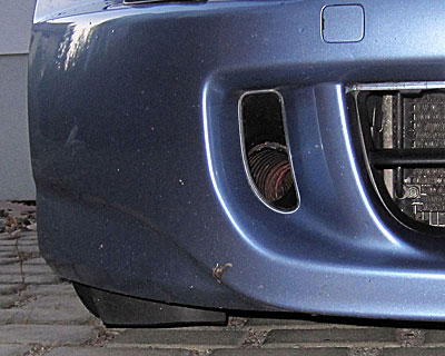 Was uns jedoch beide beschäftigt sind die beiden Öffnungen mit beinhalteten schwarzen Blenden rechts und links vom Kühlereinlaß in der Frontschürze. Eine Nachschau dahinter ergab nur, dass beide Öffnungen in der Verlängerung im Rahmen enden und nicht wie zuerst vermutet evtl. der Luftzufuhr zum Motorraum dienen. Was noch in Betracht käme wäre die Funktion als Zusatzscheinwerferaufnahme.