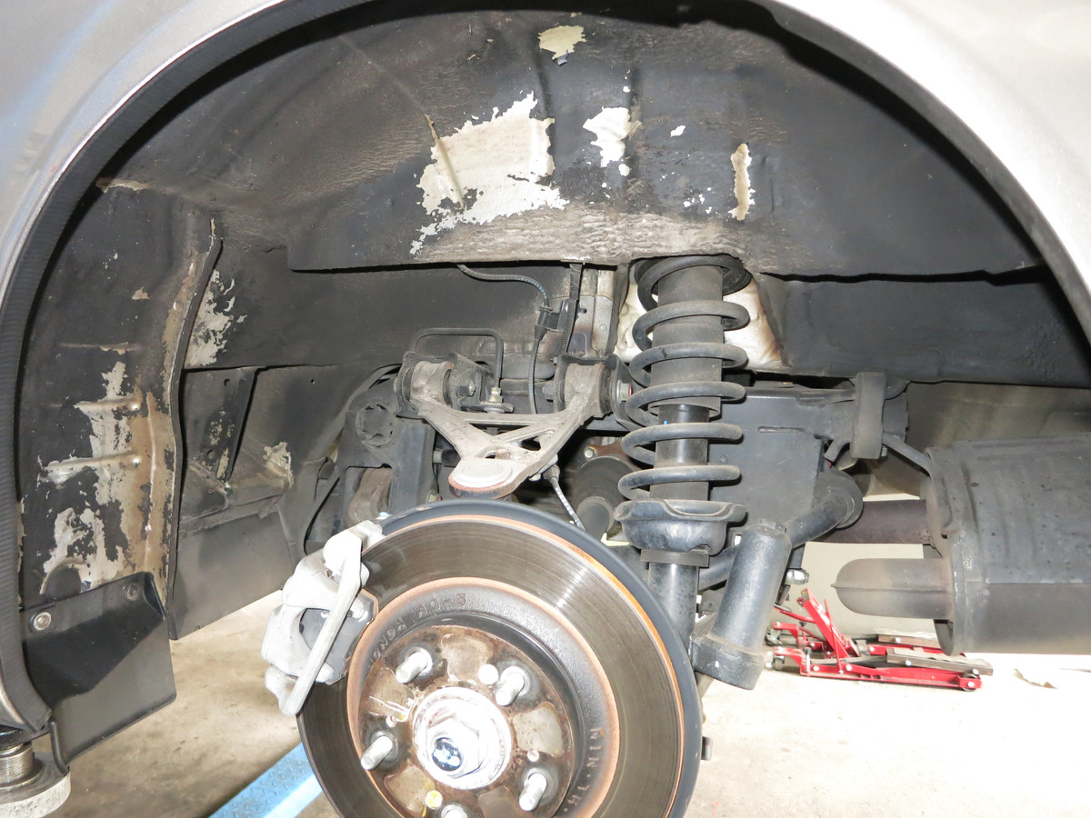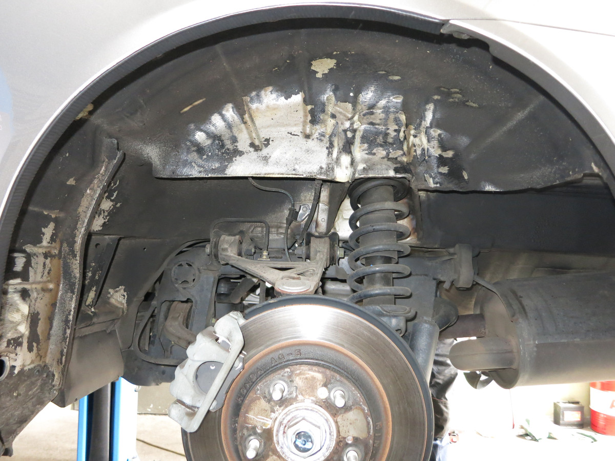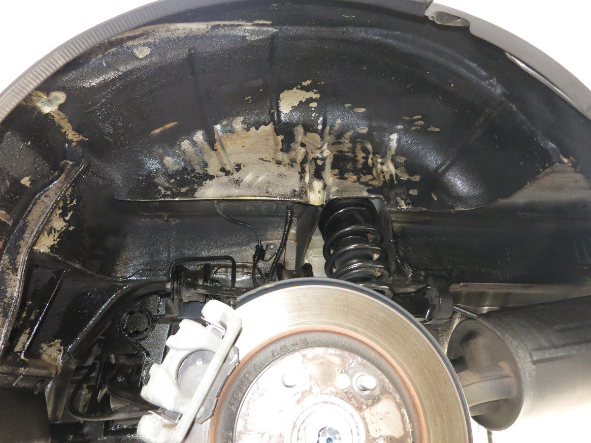 Nochmal in der Totale, nachdem nun der lose Unterbodenschutz aus dem Radhaus entfernt wurde. Das Entfernen von den losen Bestandteilen war notwendig, damit ein tragfähiger Untergrund vorhanden ist.