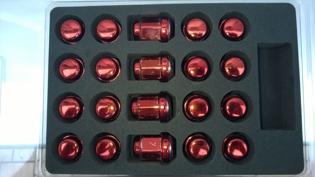 ich habe noch einen Satz rote Lugnuts rumliegen. Sind etwas länger als die OEM Teile und rot eloxiert. Und haben einen Kugelbund, sind also mit OEM Felgen fahrbar.