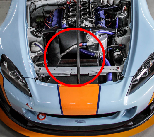 Wo ich das grad mal wieder sehe... Was genau bringt das schwarze Blech, das die Luft vorne oben aus der Motorhaube rausführt (s. roter Kreis im Bild)?