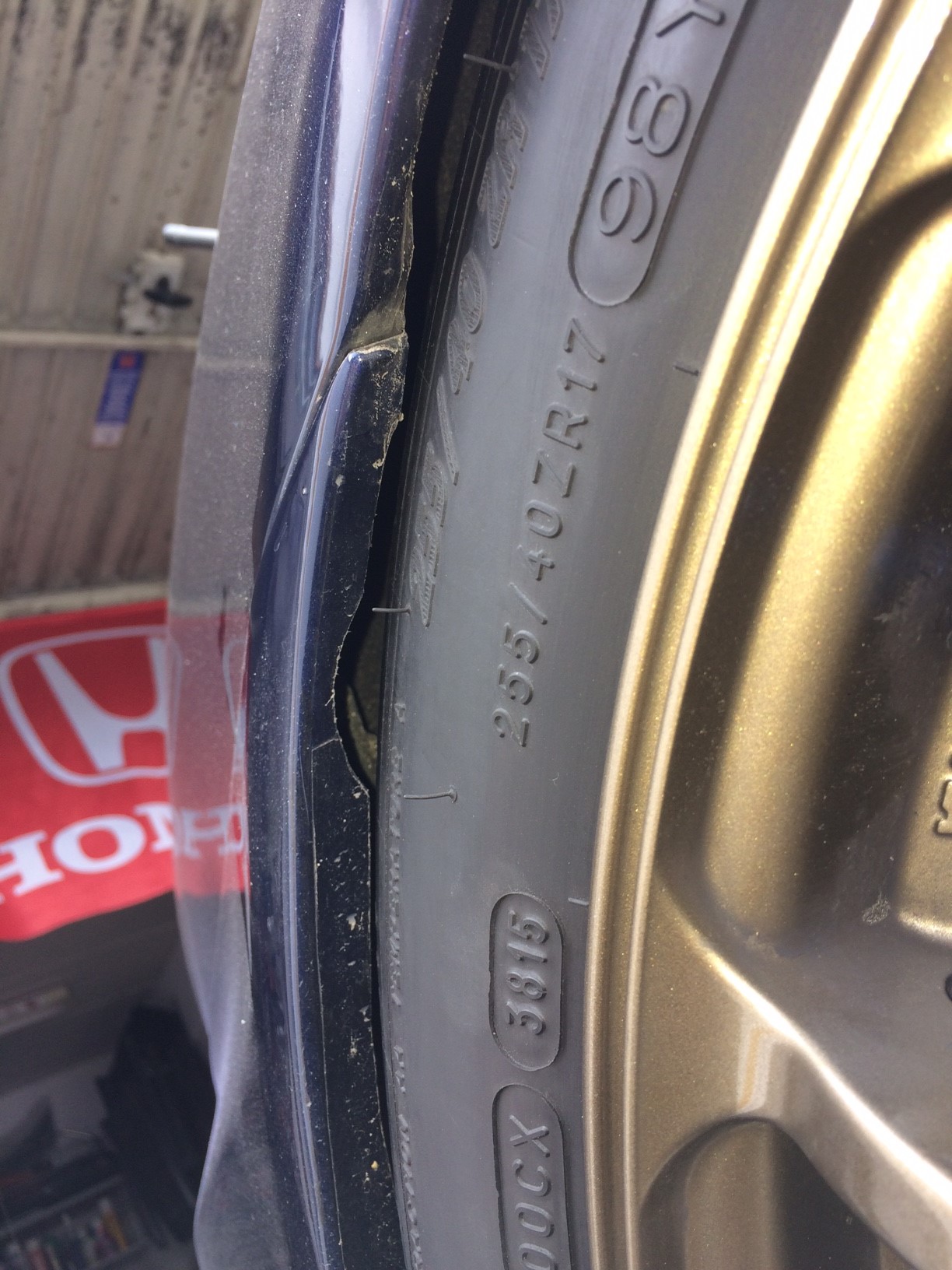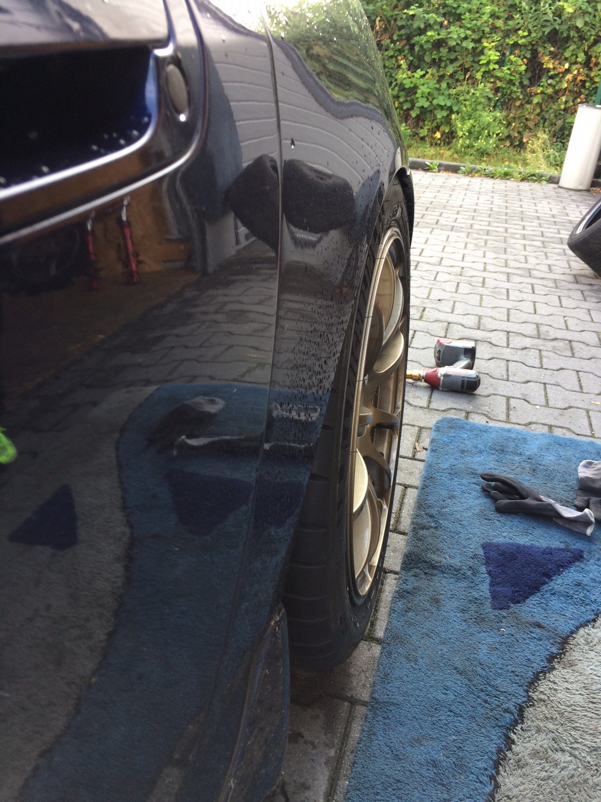 Also fix den Reifen aufgezogen und das Auto schräg über Kreuz verschrenkt. Stellte sich raus dass es doch besser aussah wie ich dachte. Also hab ich vorsichtshalber dann das Material was dann noch überstand weggenommen und leicht gebördelt.