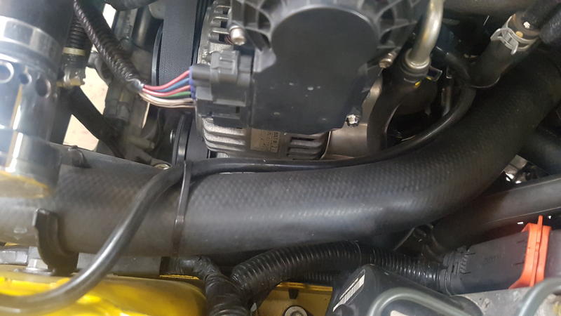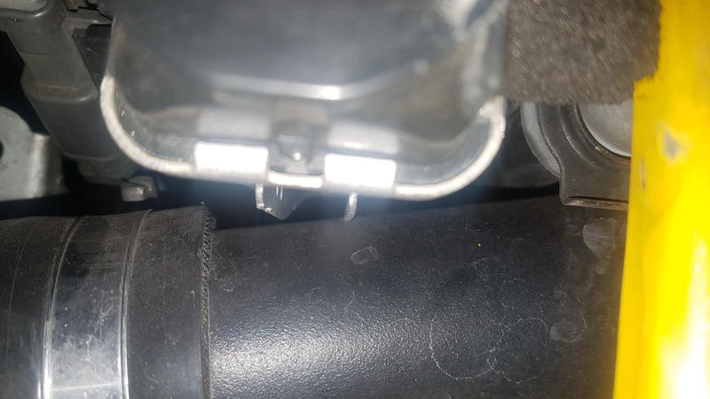 Das erste was mir auffiel war das der obere Wasserschlauch nicht richtig eingehängt ist. Hat wohl länger keiner gemerkt, da am Wasserschlauch schon spuren des Blow Offs zu sehen waren: