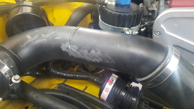 Ein Ladedruckrohr wurde so schlecht verlegt das es am Wasserkühler ansteht. Der Wasserkühler hat sich dann mit der Zeit schön in das Ladedruckrohr rein gearbeitet: