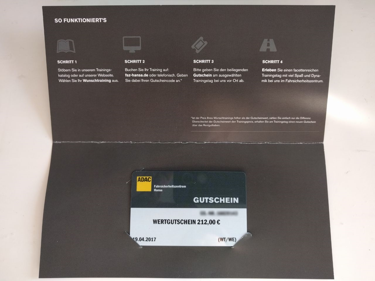 Hallo,in kurz:- Wert des Gutscheins ist 212€- für jedes ADAC Training in Deutschland- an jedem ADAC Stützpunkt in Deutschland- Wochentags UND Werktags nutzbarBiete hier einen ADAC Gutschein für ein Training Ihrer Wahl. Wert des Gutscheins ist 212 €. Ist der Preis des Wunschtrainings höher, muss man nur die Differenz zahlen.Auf dem Gutschein steht "FSZ Hansa", ist aber laut ADAC Mitarbeiter überall in Deutschland gültig (habe ich mir doppelt schriftlich geben lassen).Der Gutschein ist bis zum 19.04.2018 gültig.Versand des Gutscheins ist möglich.Fahrsicherheitszentren des ADAC finden sich in ganz Deutschland:https://www.adac.de/produkte/fahrs…en/default.aspxFestpreis: 160 €