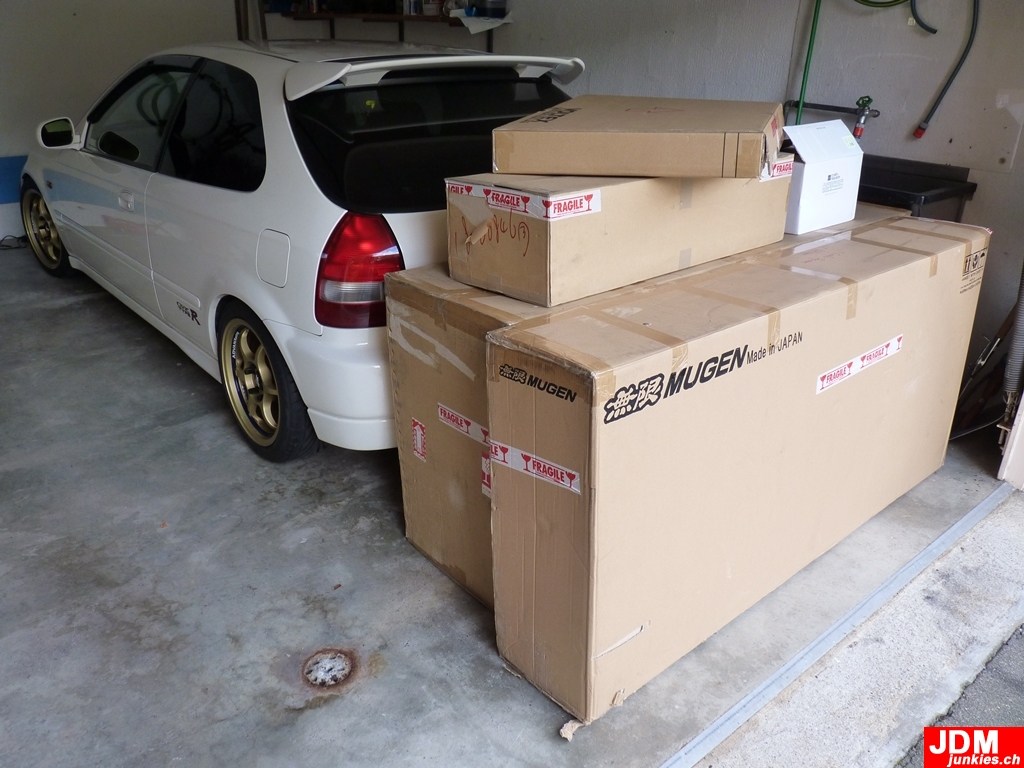 Die Felgen kamen mit einem Monat Verspätung, ich konnte aber mit denen noch nichts anfangen, ohne die Teile aus Japan. Das grosse Paket aus den USA kam mit zwei Monaten Verspätung, hatte nicht direkt etwas mit den Felgen zu tun, sollte nur die Optik abrunden. Also erst mal alles in den Keller gestellt.