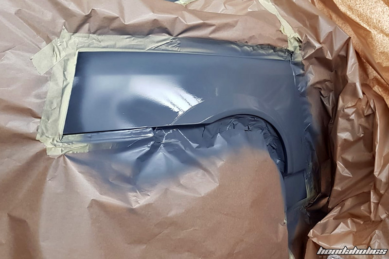 Der Heckdeckel wurde schliesslich komplett lackiert, damit die neuen Löcher nicht rosten und auch die Verstärkungen wie OEM in Wagenfarbe daher kommen (auch wenn das innen kaum jemand sieht).