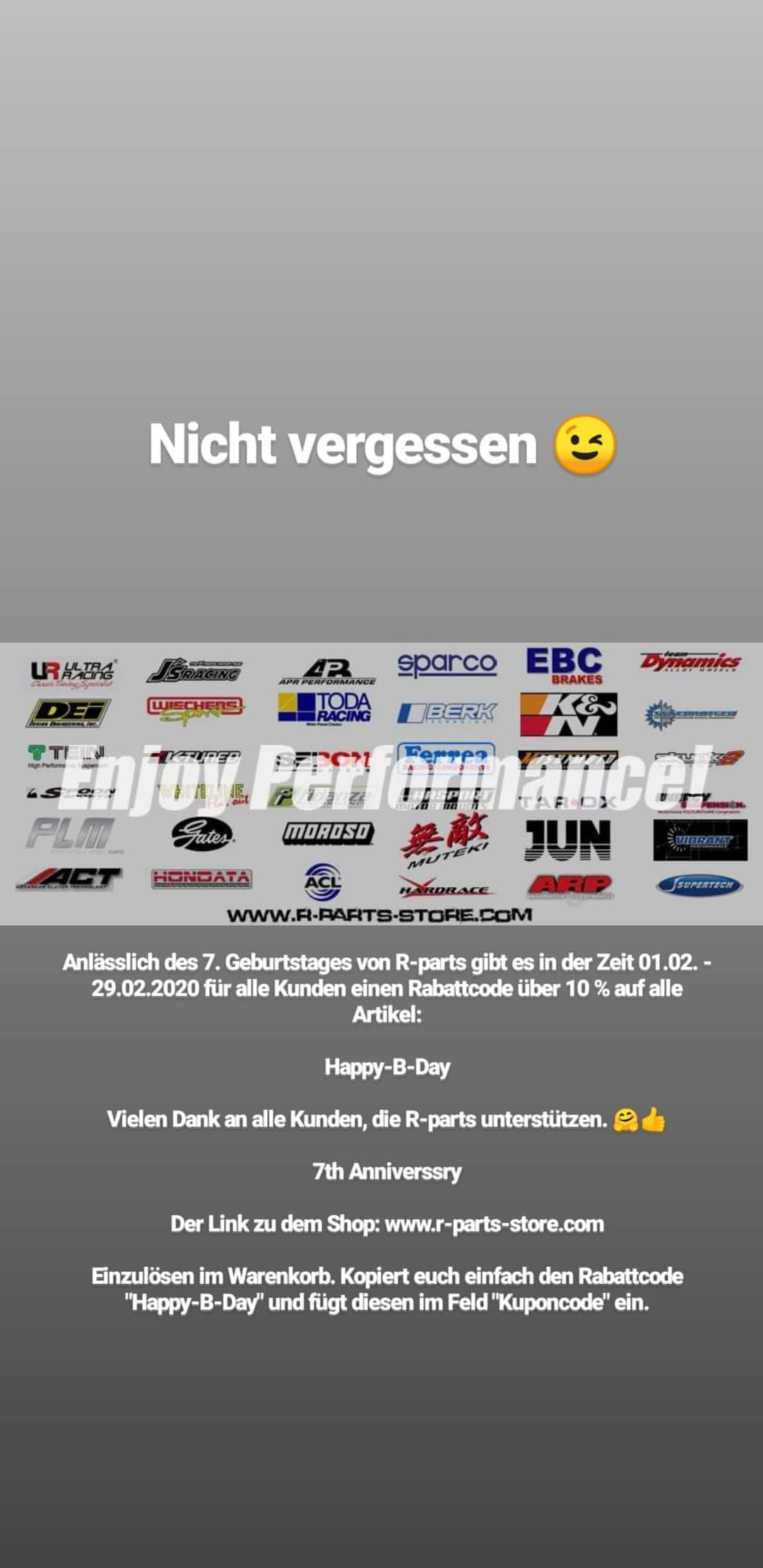 Anlässlich des 7. Geburtstages von R-parts gibt es in der Zeit 01.02. - 29.02.2020 für alle Kunden einen Rabattcode über 10 % auf alle Artikel: