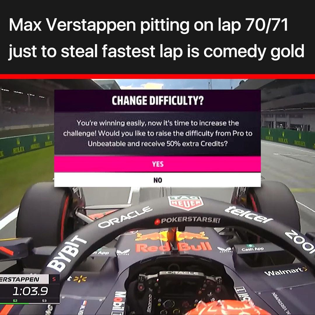 Verstappen macht das was er schon die letzten Rennen macht - side quests während des Rennens. Diesmal war es Reifenabrieb auf der Strecke, mit dem er eine Runde zu kämpfen hatte ![]()