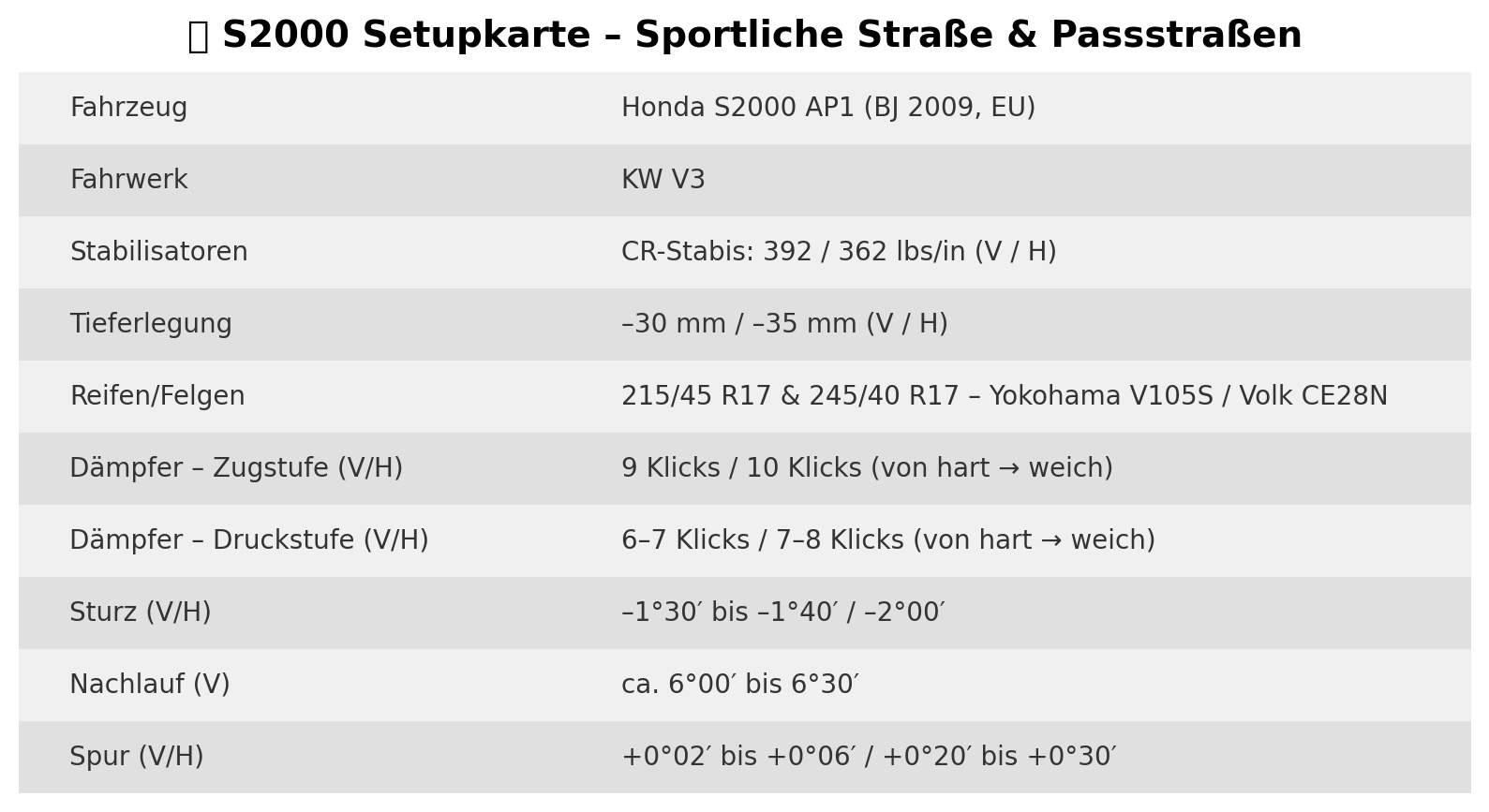- Track‑Version orientiert sich grob an Raeder Track, verschiebt aber 1 Klick Zug nach vorn und 1 Klick Druck nach hinten, um die CR‑Stabi‑Tendenz zum „Snap‑Oversteer“ einzufangen.