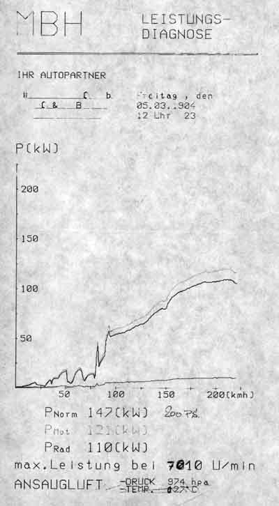 Gemessen wurden P(Norm)=147kW; P(Mot)=121kW; P(Rad)=110kW; max. Leistung bei 7010U/min; Ansaugluftdruck 974hpa; Ansauglufttemperatur 27°C;