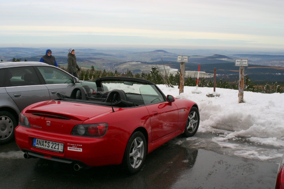 Zuerst rauf auf den Fichtelberg ( 1215 m ), da gibt es 'ne dreispurige Auffahrt (also 2 bergwärts), da kann man mal v-tech'n. Habe zwei Moppeds verblasen. Die sind aber auch bloß halbe Kraft gefahren wegen der feuchten Straße. Oben angekommen >> Winter !!Ganz oben: "Huch guck mal, ein Cabrio. Bei dem Wetter !!!