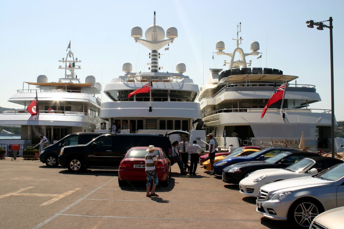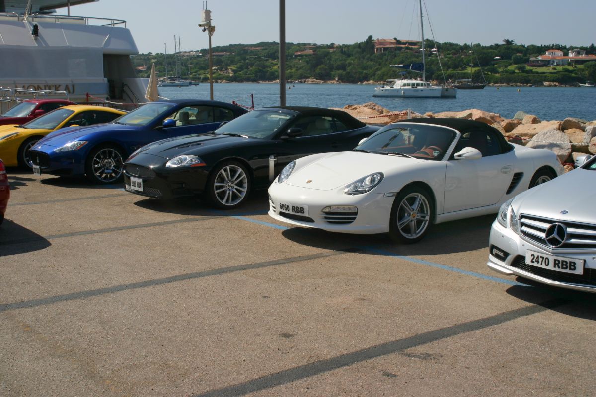 Anschließend weiter nach Porto Cervo, um noch ein paar schöne Jachten zu sehen. Davon lagen auch genug am Kai und die dazu gehörigen Wägelchen mit laufendem Motor (Klima ein, es waren 39°C) standen bereit. Schaut selbst: