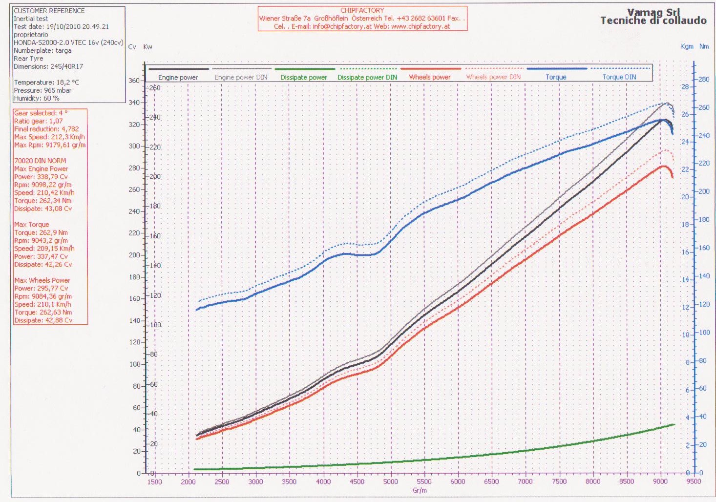 Walter, der Lader liefert schon ab ca. 2500 rpm Ladedruck, steigt dann stetig bis ca. 0,6 bar. Sogar im Stand bläst das Ding schon ordentlich was raus wenn man die Hand hinhält. Das BOV ist im Leerlauf offen beim Vortech, anders als bei Turbo BOVs. Durch das kleinere Antriebsrädchen dass verbaut wurde dreht er jetzt logischerweise noch schneller. Das ist überhaupt kein Vergleich zu OEM, da gehts richtig gut, auch im Drehzahlkeller, Leistungsverlust kann ich nicht spüren. Leistung kommt dann richtig gut ab 4500. Es sei erwähnt dass mein Lader bis zu 50.000 Umdrehungen effizient dreht. In Zukunft werde ich auch diese 50k ausreizen, das aber fühestens nächste Saison. Fühlt sich sehr schön an weil das Drehmomentmaximum sehr sehr spät ist. Wie oben schon erwähnt ist der Leistungsprüfstand wo wir eingestellt haben nehme ich an mit den Zahlen sehr bescheiden, ich leg meine Hand is Feuer das ein guter Serien-S nie bei dem Prüfstand auf seine 240 PS kommt. Aber das ist doch Nebensache, ich finde die Kurve kann sich sehen lassen, vielleicht mach ich noch mal einen Dynorun auf einem Bosch Prüfstand um zu vergleichen. Wenn du wieder in Wien bist kannst gerne eine Runde mit meinem S2000 drehen um dir selber ein Urteil zu schaffen.