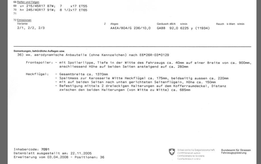 Es ist die Typengenehmigung 1HA286, also diejenige für Modelle ab ca. Modelljahr 2005 (wenn Ihr unsicher seid, schaut im Fahrzeugausweis bei Nummer 24). Für diese ist der (bzw. die) Flügel also zugelassen, für die älteren nicht!