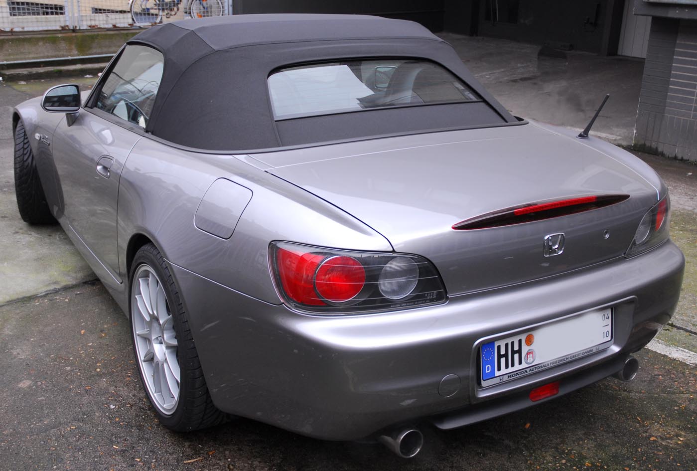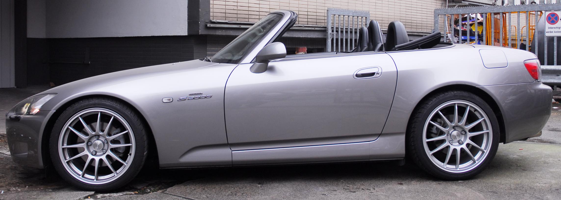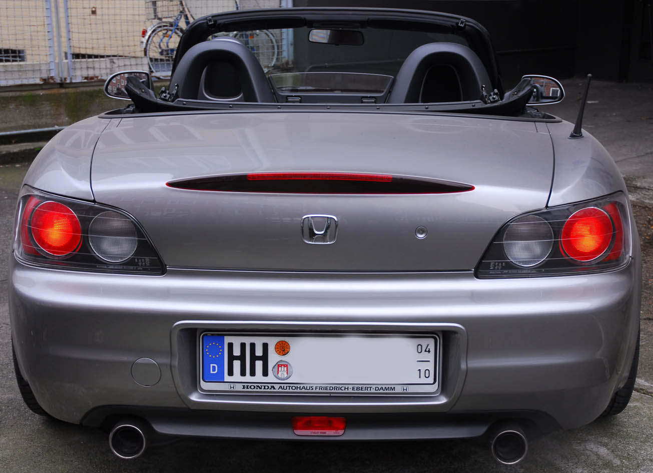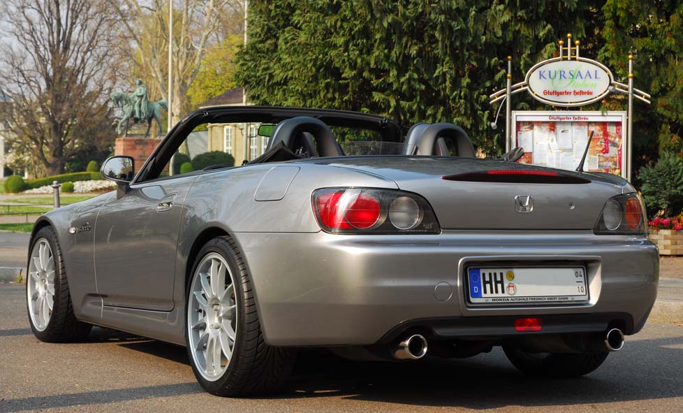 Verkaufe meinen S2K in Stuttgart: Gepflegtes Garagenfahrzeug. 1. Hand. Unfallfrei. TÜV und AU neu. Top-Zustand. Teppiche und Leder 1A. Von Nichtraucher. Alle Inspektionen bei Honda durchgeführt. Letzte Inspektion mit Ölwechsel vor 1500 km. Nur bei gutem Wetter zwischen April und Oktober gefahren (Saisonkennzeichen). Silbergrau-metallic. Mit 18-Zoll-Felgen O.Z. Superleggerare. Dunlop-Bereifung 225/40 ZR 18 vorne, 255/35 ZR 18 hinten. Noch ca. 80 - 90%. Leder-Sportsitze in schwarz. Schwarze Innenausstattung. Mit Sitzheizung. Elektrisches Verdeck. Xenonlicht. Elektrische Fensterheber. Klimaanlage. CD-Radio mit Fernbedienung. Separate Hochtöner in der Tür. DVD-Navigationssystem mit großem Monitor und Fernbedienung von VDO. Mit Spezialhalterung integriert. Um Rückfahrkamera und zusätzliche Module erweiterbar. Eibach-Federn. 30 mm tiefer. Alles eingetragen. Zentralverriegelung mit Funkfernbedienung. Heizbare Glasheckscheibe.