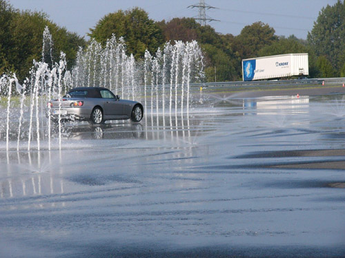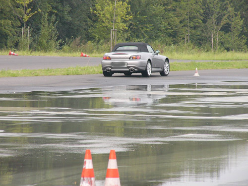 Aber es stimmt mein Mann hat einmal die gesamte Länge der Fahrbahn zum Bremsen benötig. Erst im trockenen Bereich kam er zum stehen. Aber er fuhr auch deutlich schneller in die Bremsstrecke ein, als alle anderen.