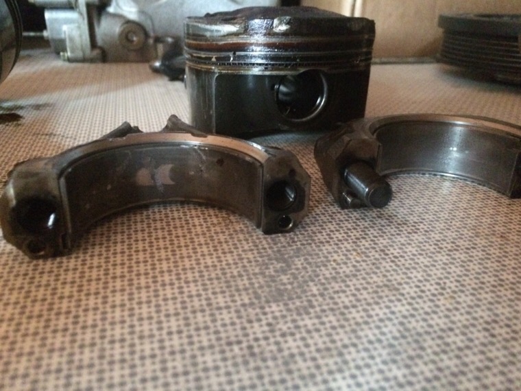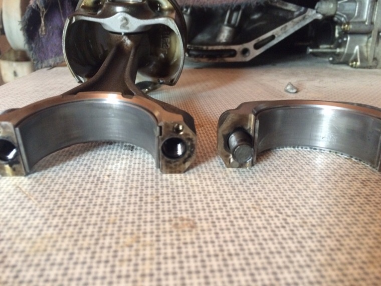 Ich Tippe ich auf einen Fresser durch unzureichende Kühlung von Kühlmittel und/oder Öl. Das anstehen des Kolbens auf den Ventilen würde ich als Folgeschaden des Pleuelbruchs/abriss einstufen.