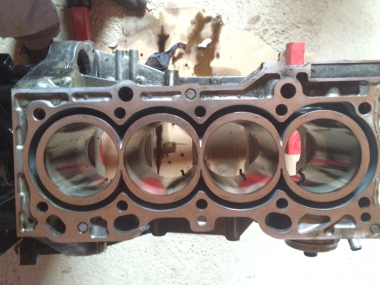 Die Hauptlager sind OK, für mich kein Grund zur Sorge. Das Axiallager der Kurbelwelle hingegen ist nicht so schön. Das Axialspiel war mit etwa 0,5mm an der Verschleißgrenze, die Abnutzung in Zugrichtung der Kupplung ist deutlich zu sehen und zu spüren. Das Axiallager hat bei den etwa 80tkm sein Ende erreicht. Foto davon hab ich auf die schnelle keins, kann ich aber bei bedarf nachreichen.Nachdem die Kolben ausgebaut waren, der von Zylinder 4 musste rausgeschlagen werden, konnte die FRM Beschichtung gut begutachtet werden.