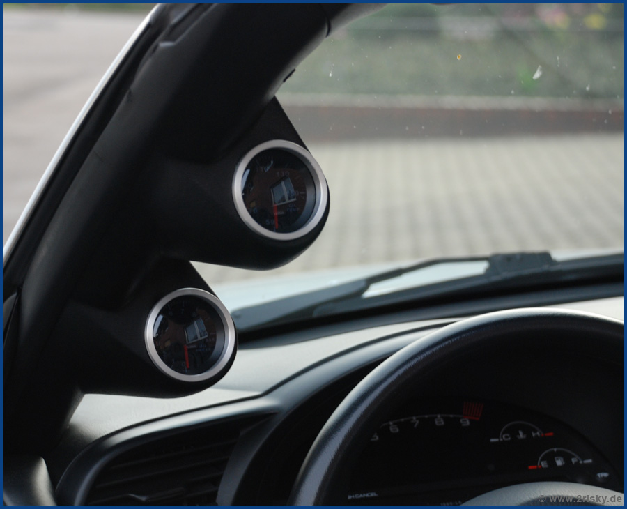 Hat was länger gedauert, aber Die A-Säulenhalterung ist jetzt auch verbaut (Danke Yves). Mir gefielen die Armaturen (Öldruck und Temp) sehr gut, nur der Rand der Dinger war irgendwie zu dick. Hab mir deshalb bei nem Kumpel was aus Alu drehen lassen und die Armaturen rückseitig verbaut. War nen bisschen fummelei mit Kleber und Bauschaum aber hält Bombenfest. ![]()