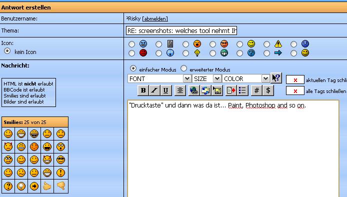 und klappt zudem auch sehr hervorragend (mal abgesehen von ein paar Sonderfällen wie zB in diversen Spielen).damit es nicht zu verwechslungen kommt, ich meine die taste auf der tastatur mit der bezeichnung "Druck" oder "Print" bzw. "Printscreen"!