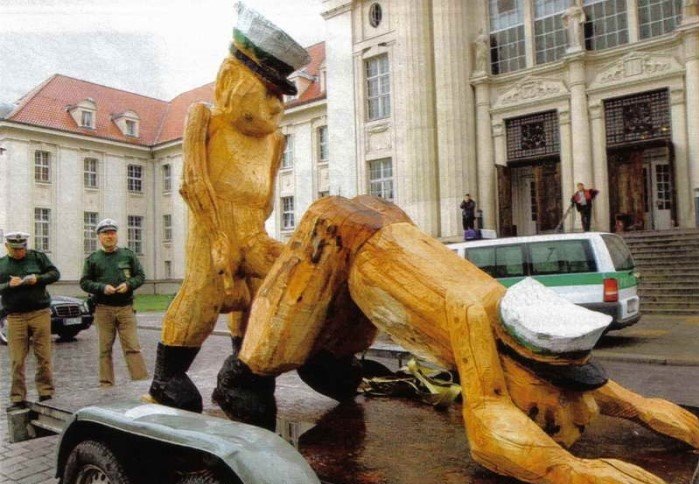 Man stelle sich eine Gruppe von lustigen Gesellen vor, die grad in der Kneipe hocken, schon einige Biers im Kopp haben und der eine erzählt, wie er vor Kurzem von der Polizei angehalten wurde und die ihn unfreundlich malträtiert haben. In dieser Bierlaune wollen se es den Bullen heimzahlen, aber auf eine lustige, gar künstlerische Art und Weise. Sie torkeln heim, packen Ihre Motorsäge, die man kurz darauf im Wald aufheulen hört. Es wird gehämmert, und geschnitzt, gebohrt und gepinselt. Das Ergebins wird auf den Trecker gepackt, gefahren von dem Kumpel mit der niedrigsten Promillezahl.